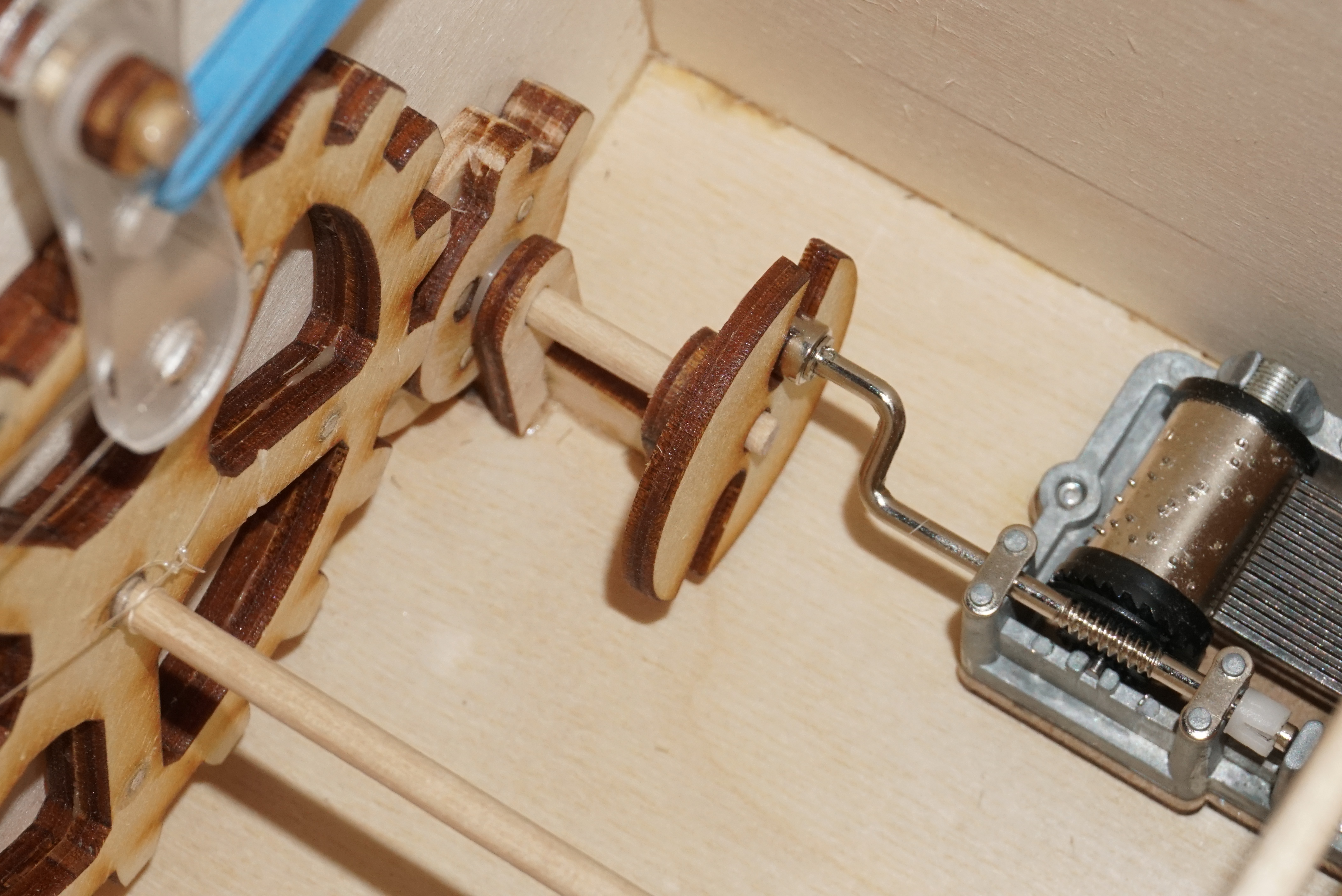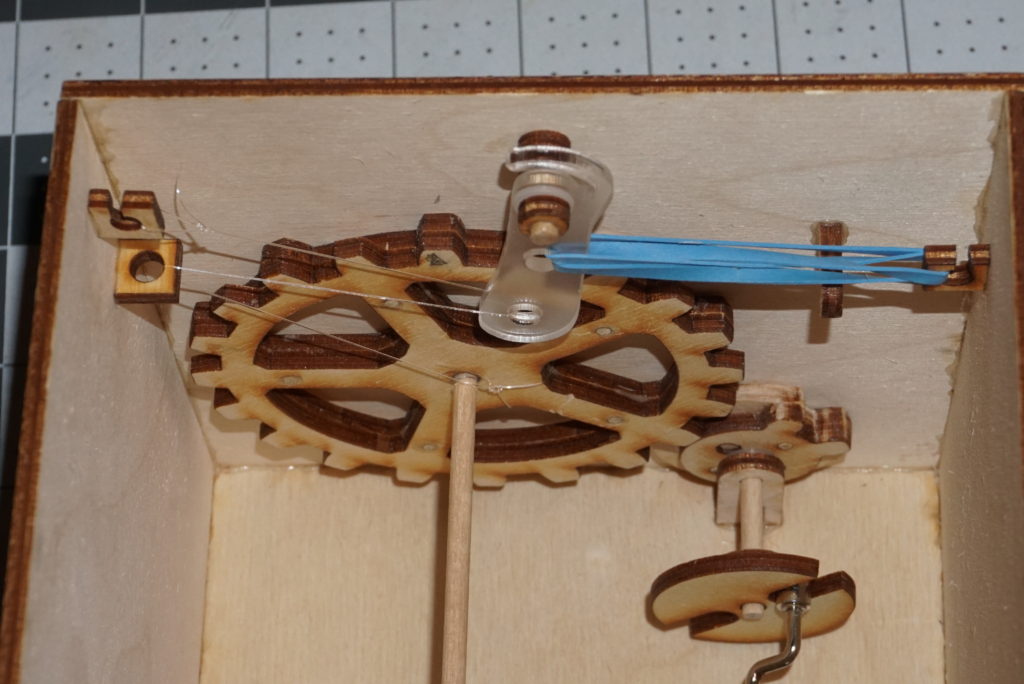 The device requires 30 turns of the crank to play the music, after which the box should open. There are different mechanisms that can be used to trigger the lock after 30 turns, but most of them either require a worm gear, fine-tooth gears (hard to do with laser-cut plywood), or have significant increase in resistance right before unlocking, which ruins the effect.