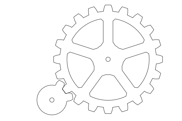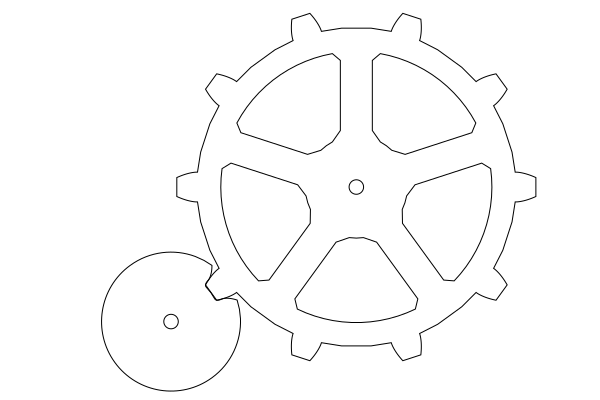 The next problem was how to create a mechanism that reduces the 30 turns of the crank to 3 turns of the shaft. A simple pair 10:1 of gears would be too bulky and wouldn’t fit inside the box. The contraption I ended up using converts one rotation of the small gear into 2 teeth worth of rotation for the large gear: